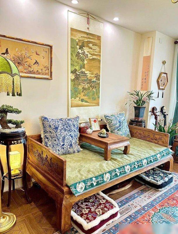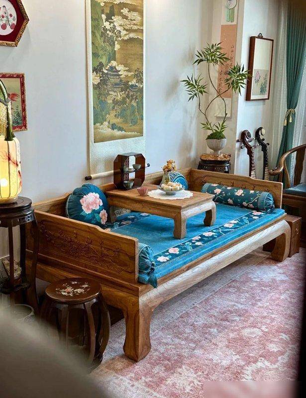 你看她选的罗汉床,北方老榆木的白胚,自己亲手烫蜂蜡、涂花梨色木蜡油,那质感不是家具城卖的“新红木”能比的——就像老茶缸子泡的茶,比奶茶店的果茶多了层“岁月的润劲儿”。我朋友之前装新中式,咬咬牙买了套大红木沙发,结果客厅塞得满满当当,坐上去像进了博物馆,连追剧都不敢吃薯片怕蹭脏。可这姑娘的罗汉床不一样,矮矮的、敦敦的,既当沙发又能躺,周末蜷在上面看剧,旁边摆个自己收的青瓷小茶杯,这不就是“把宫廷的精致揉进日常”吗?